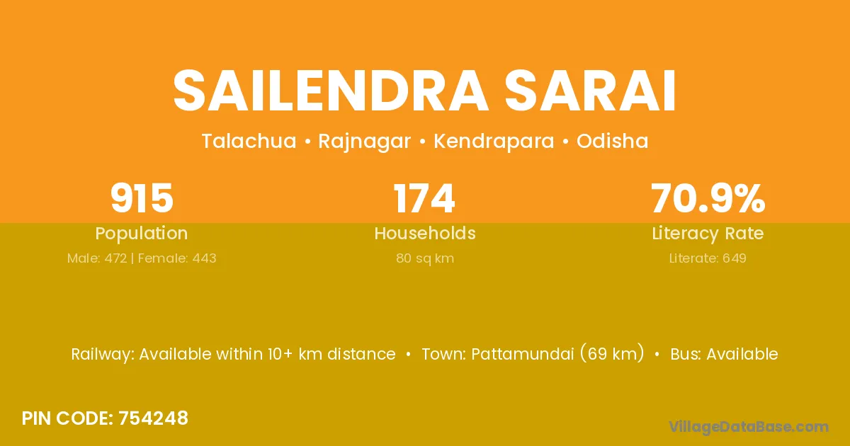 Pattamundai (69 km) is the nearest town to Sailendra Sarai village for major economic activities and is located approximately 69 km away.