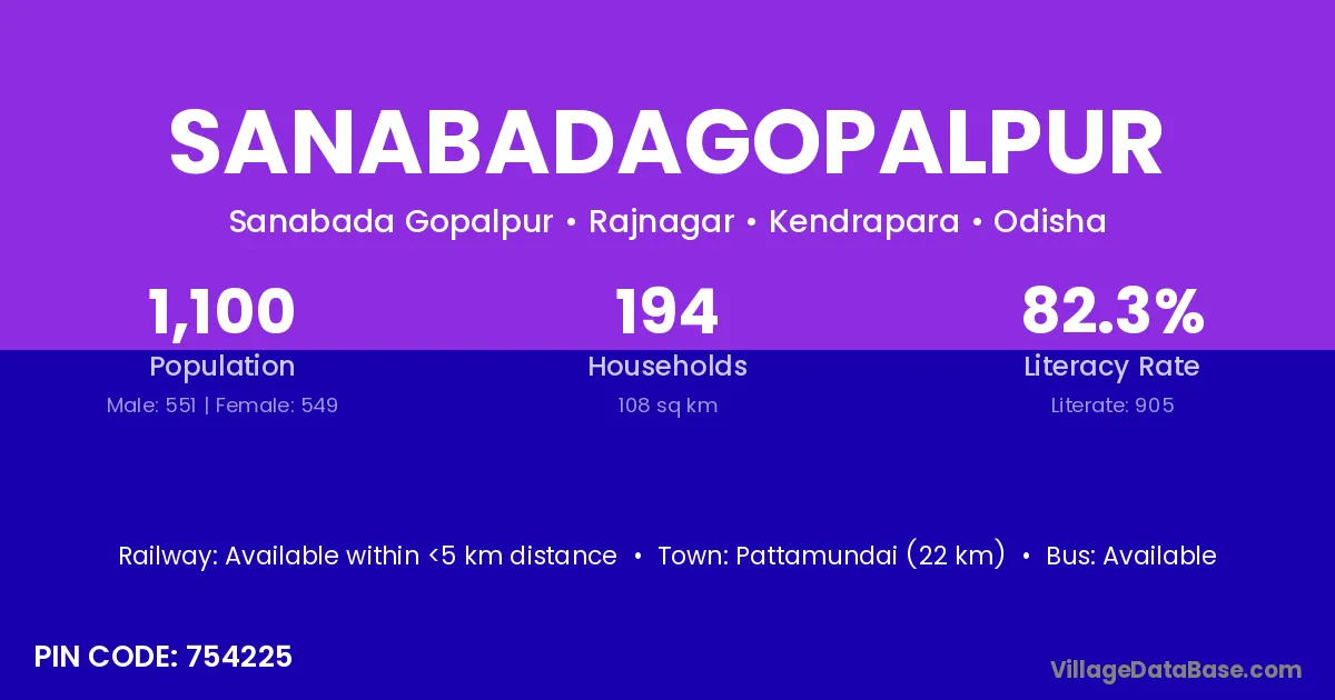 Sanabadagopalpur village has a total population of 1,100 people, of which 551 are males and 549 are females.