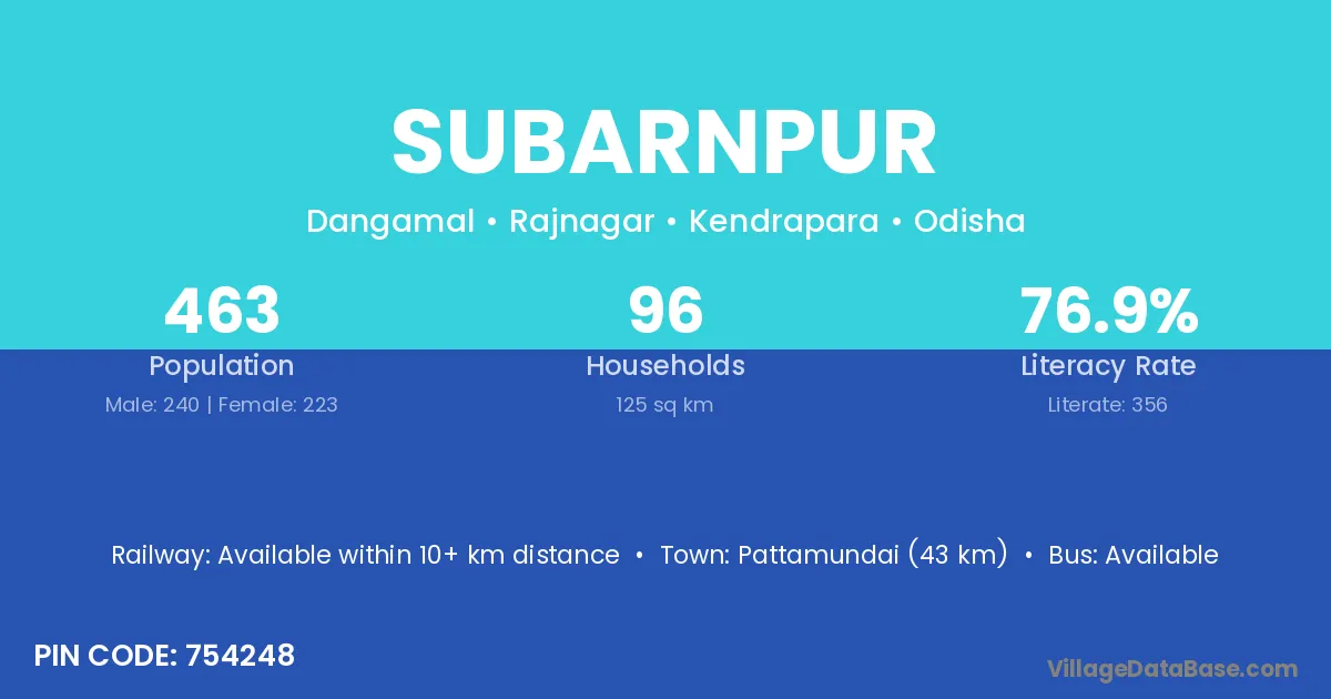 Pattamundai (43 km) is the nearest town to Subarnpur village for major economic activities and is located approximately 43 km away.