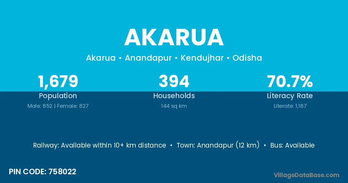 Anandapur (12 km) is the nearest town to Akarua village for major economic activities and is located approximately 12 km away.