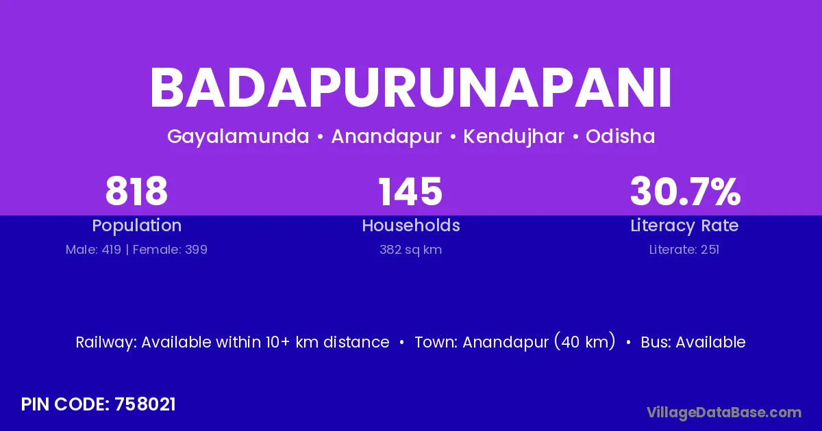 Anandapur (40 km) is the nearest town to Badapurunapani village for major economic activities and is located approximately 40 km away.