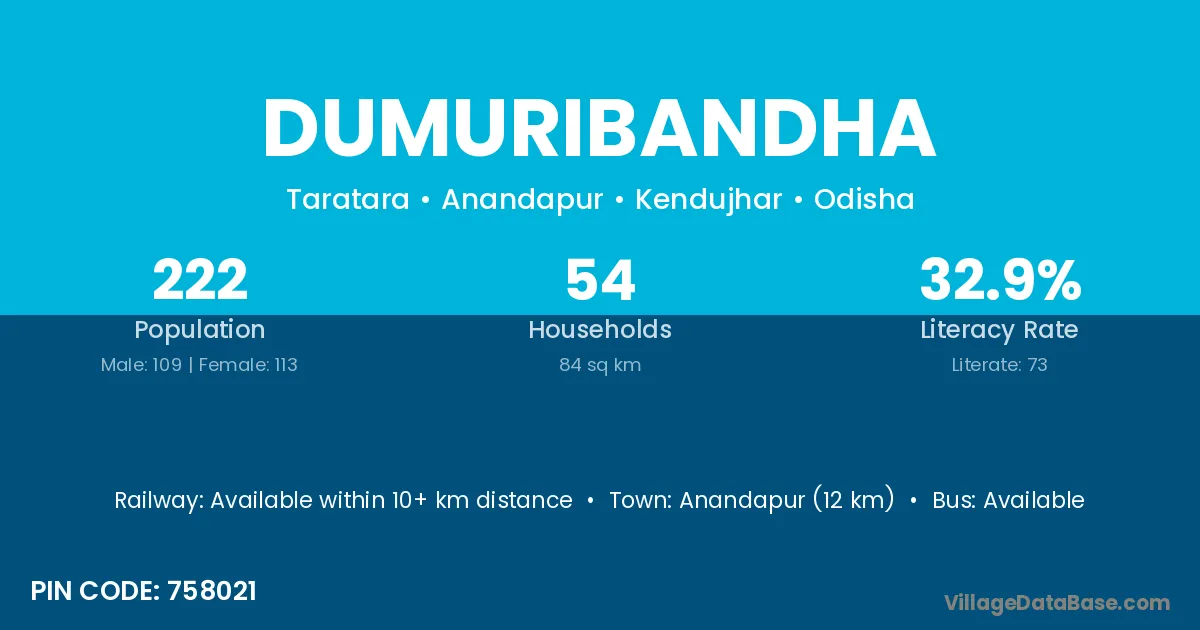Anandapur (12 km) is the nearest town to Dumuribandha village for major economic activities and is located approximately 12 km away.