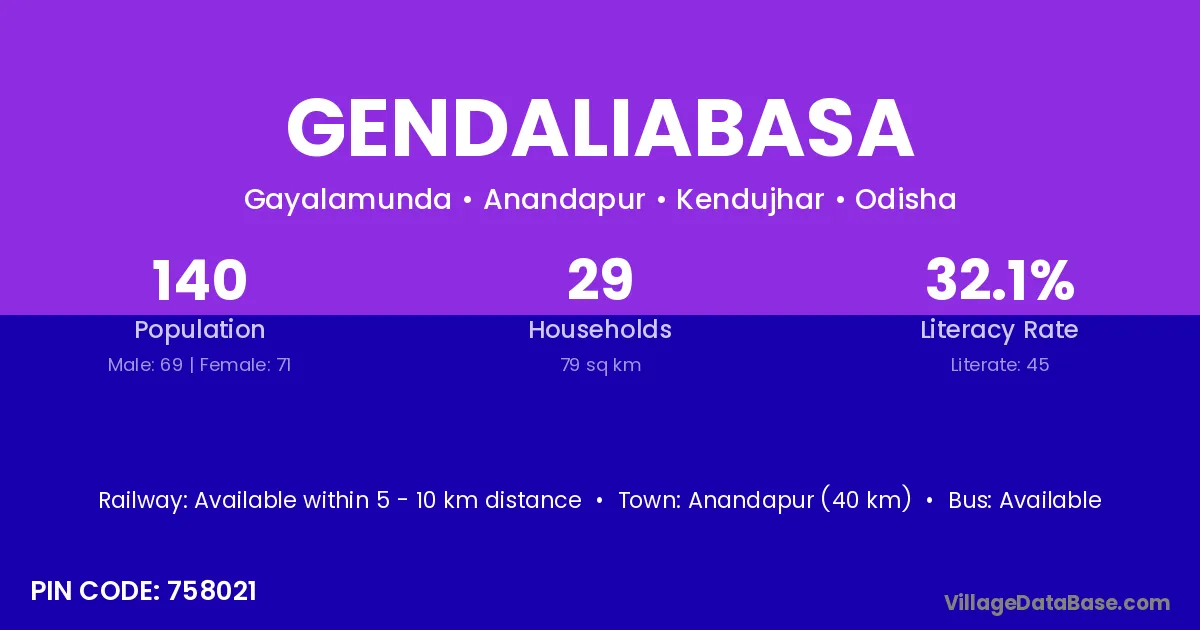 Anandapur (40 km) is the nearest town to Gendaliabasa village for major economic activities and is located approximately 40 km away.