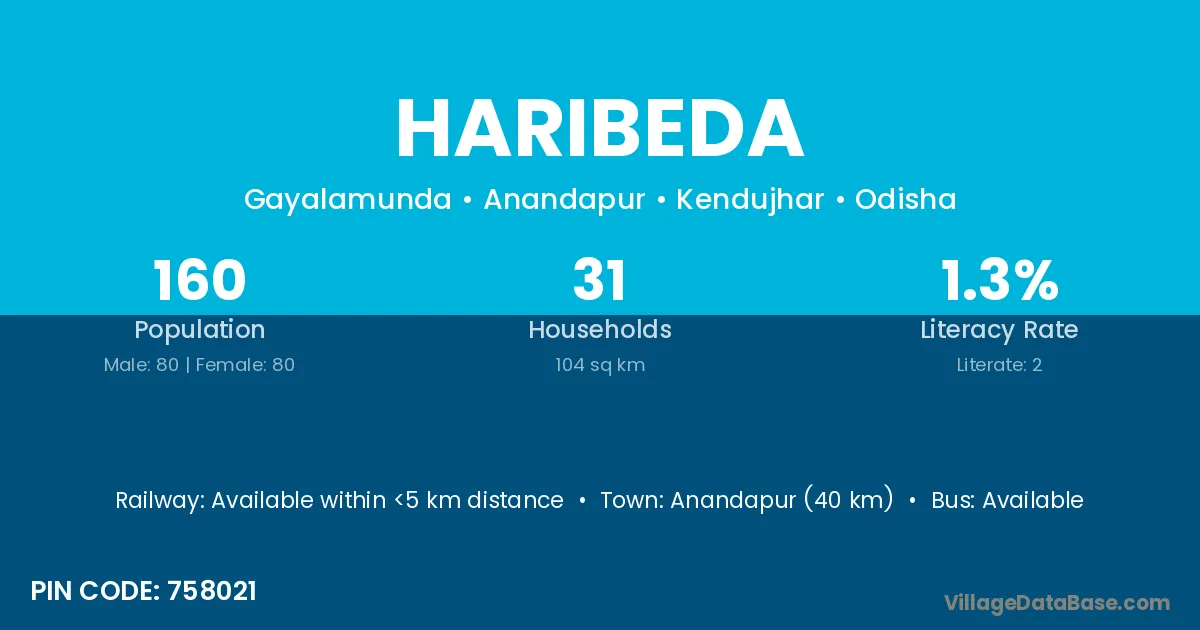 Anandapur (40 km) is the nearest town to Haribeda village for major economic activities and is located approximately 40 km away.