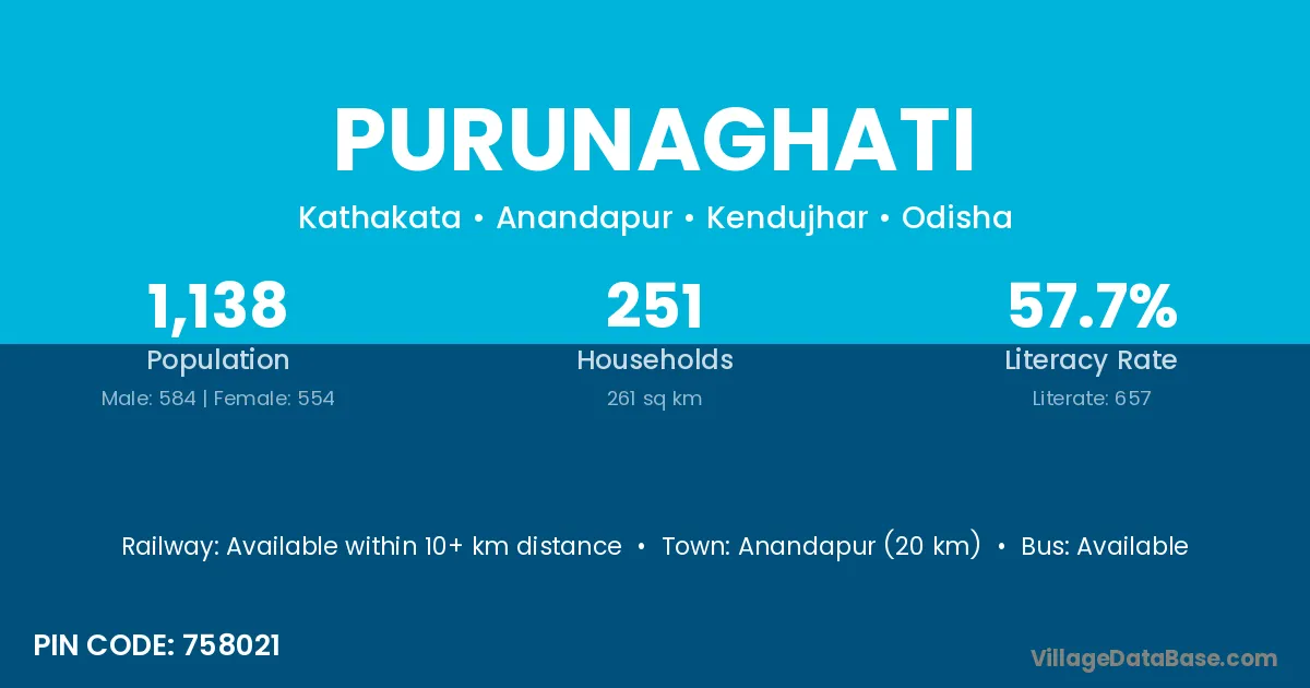 Anandapur (20 km) is the nearest town to Purunaghati village for major economic activities and is located approximately 20 km away.