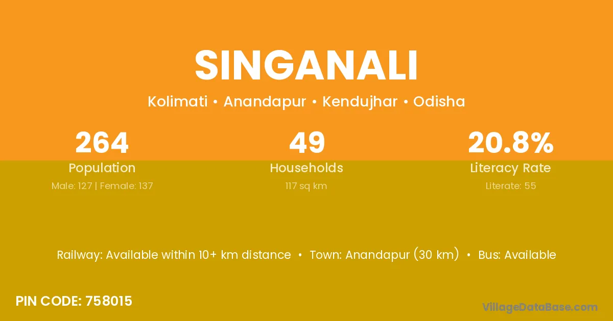 Anandapur (30 km) is the nearest town to Singanali village for major economic activities and is located approximately 30 km away.