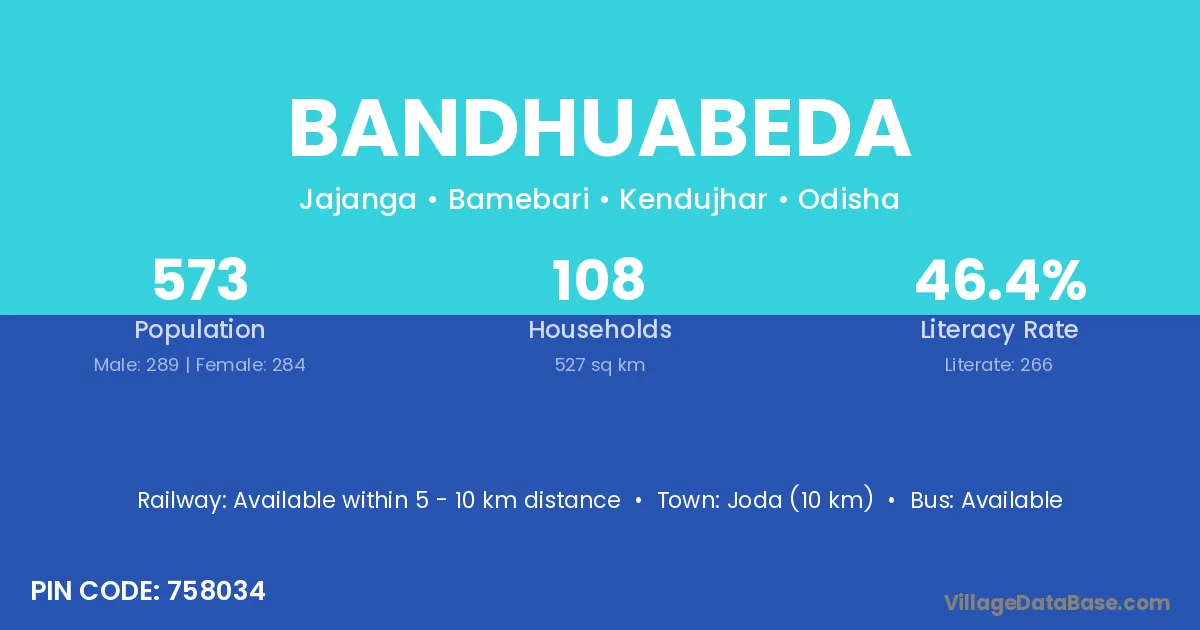 Bandhuabeda village has a total population of 573 people, of which 289 are males and 284 are females.
