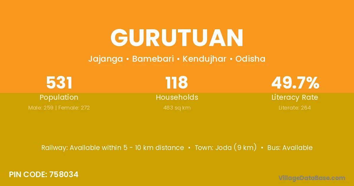 Joda (9 km) is the nearest town to Gurutuan village for major economic activities and is located approximately 9 km away.