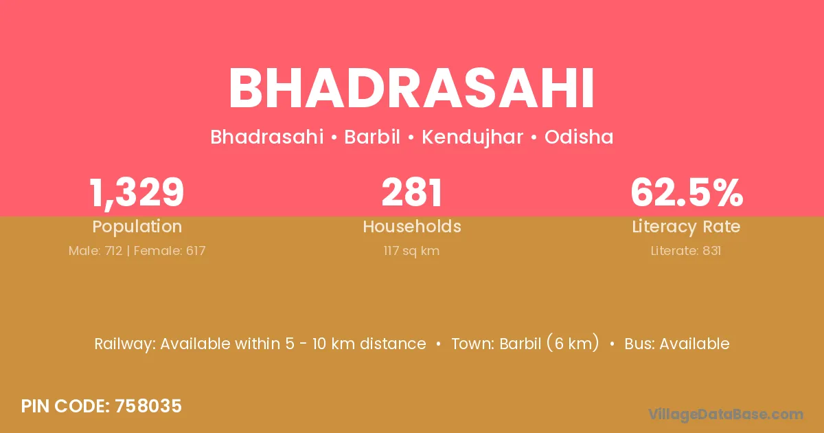 Barbil (6 km) is the nearest town to Bhadrasahi village for major economic activities and is located approximately 6 km away.