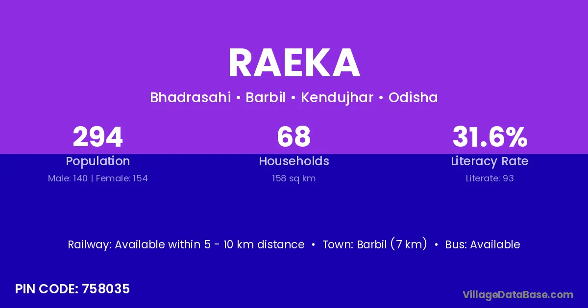 Barbil (7 km) is the nearest town to Raeka village for major economic activities and is located approximately 7 km away.