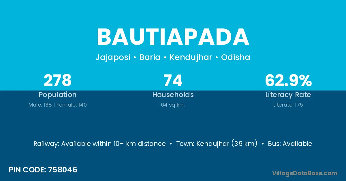 Kendujhar (39 km) is the nearest town to Bautiapada village for major economic activities and is located approximately 39 km away.