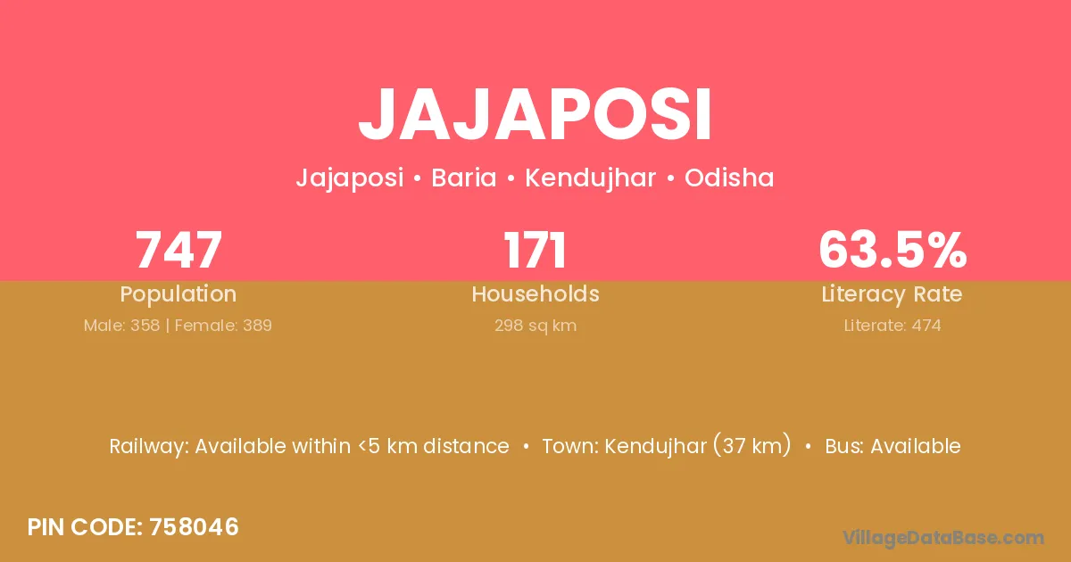 Kendujhar (37 km) is the nearest town to Jajaposi village for major economic activities and is located approximately 37 km away.