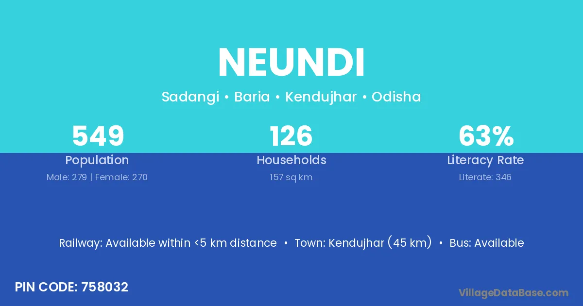 Kendujhar (45 km) is the nearest town to Neundi village for major economic activities and is located approximately 45 km away.