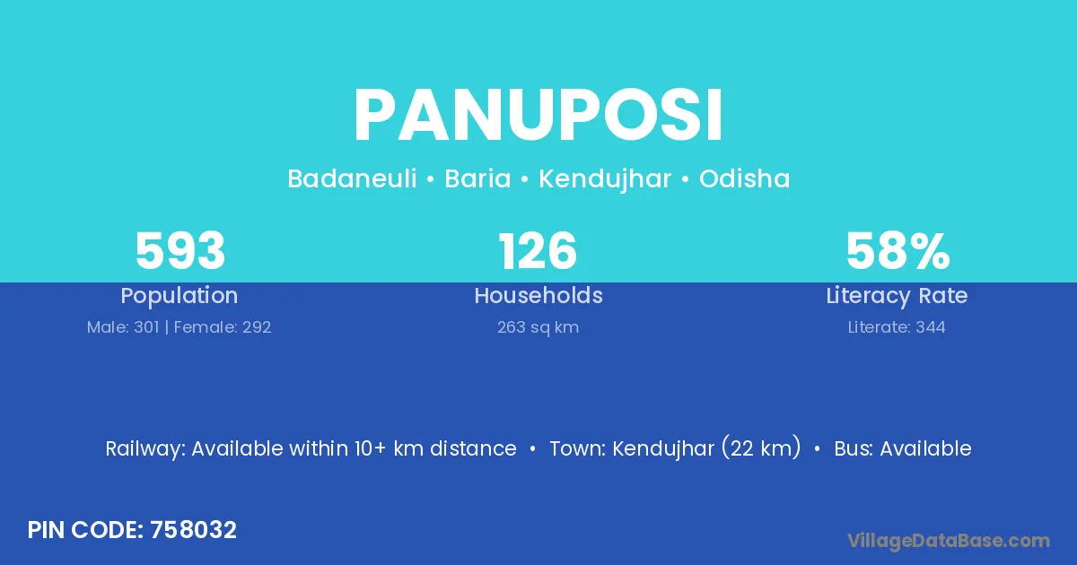 Kendujhar (22 km) is the nearest town to Panuposi village for major economic activities and is located approximately 22 km away.