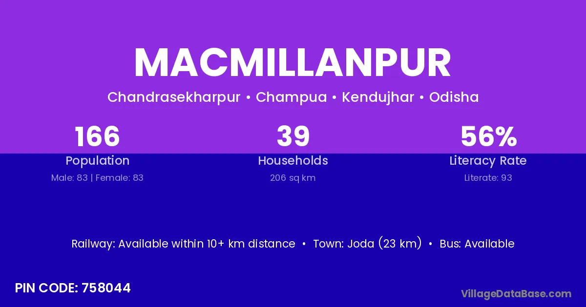 Joda (23 km) is the nearest town to Macmillanpur village for major economic activities and is located approximately 23 km away.