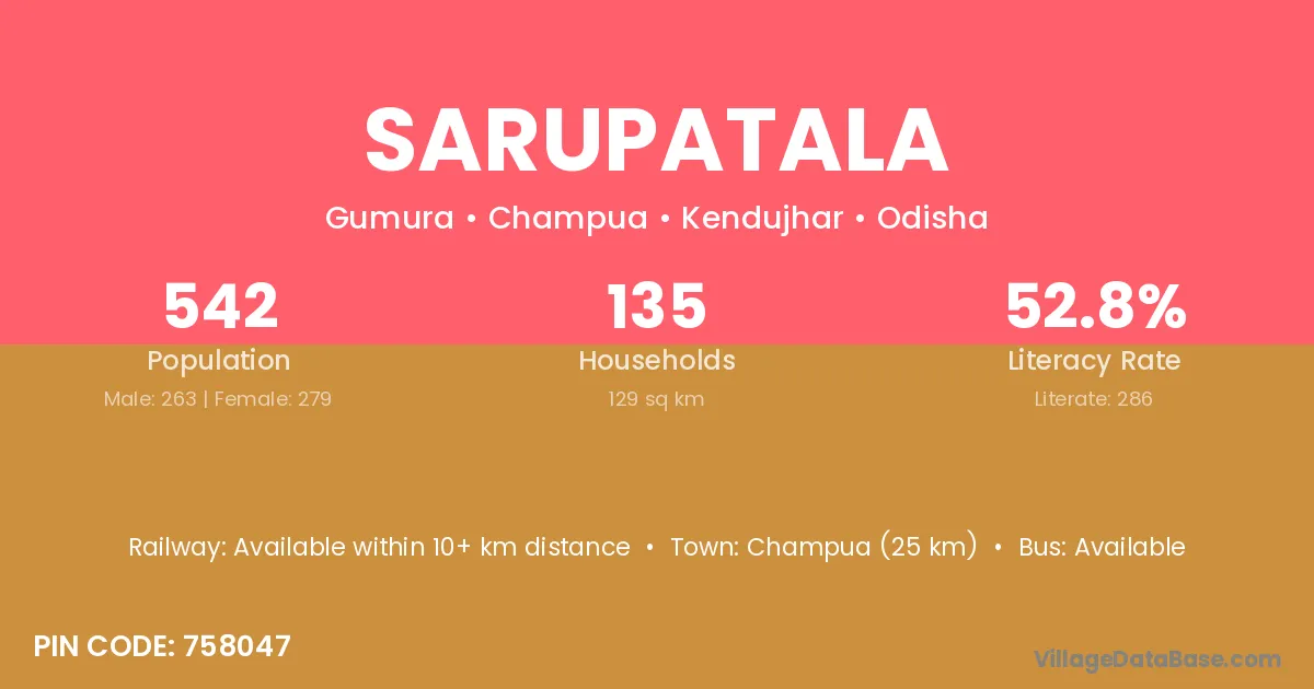 Sarupatala village has a total population of 542 people, of which 263 are males and 279 are females.