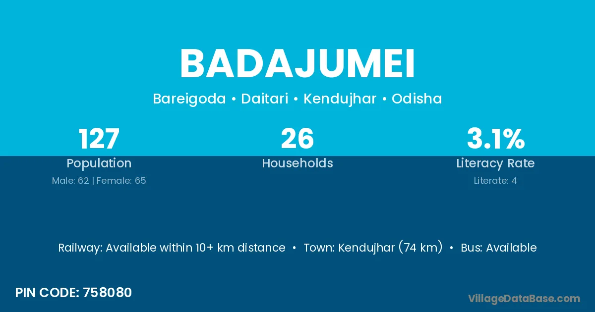 Kendujhar (74 km) is the nearest town to Badajumei village for major economic activities and is located approximately 74 km away.