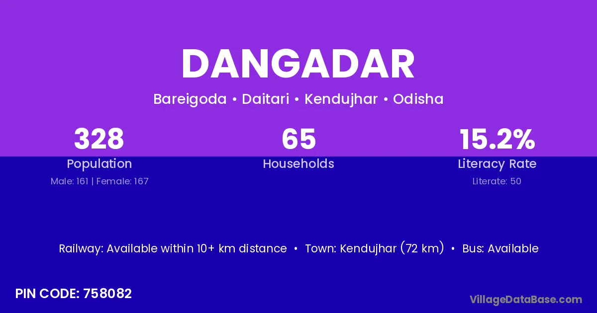 Kendujhar (72 km) is the nearest town to Dangadar village for major economic activities and is located approximately 72 km away.