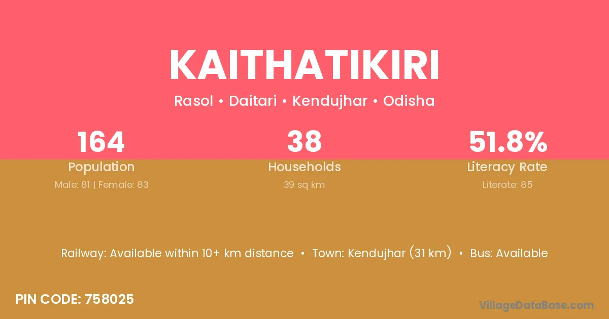 Kendujhar (31 km) is the nearest town to Kaithatikiri village for major economic activities and is located approximately 31 km away.