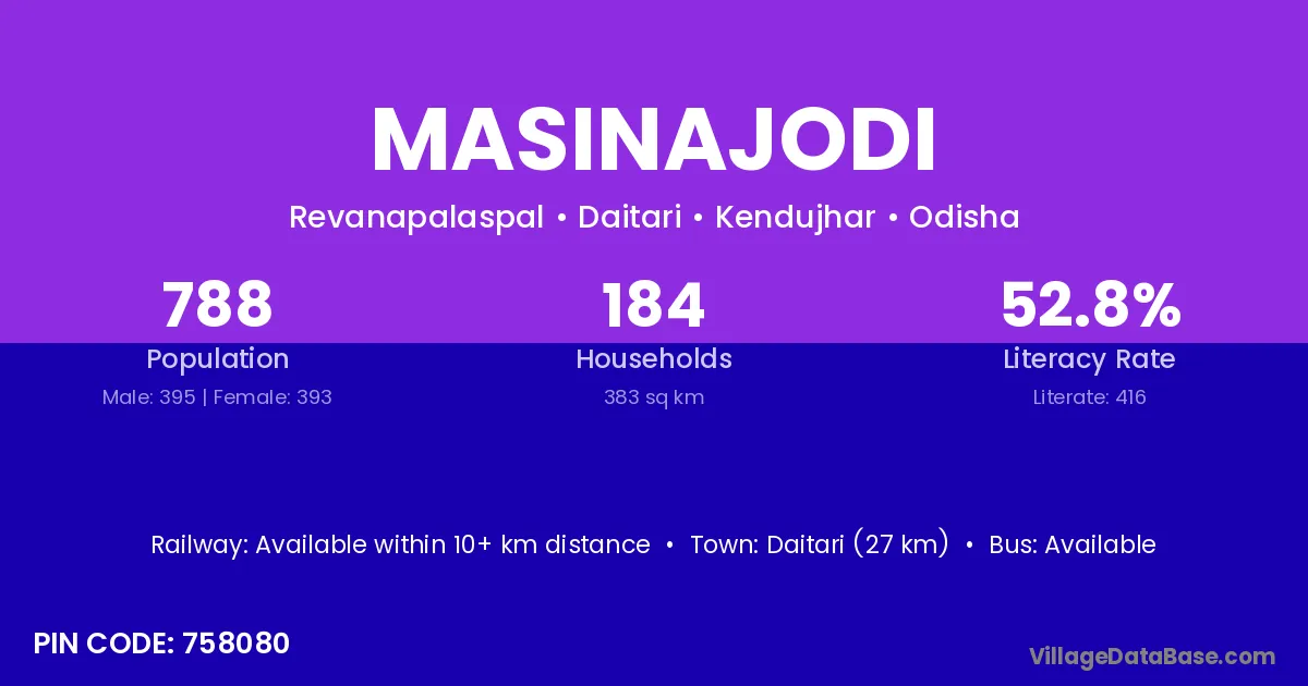 Daitari (27 km) is the nearest town to Masinajodi village for major economic activities and is located approximately 27 km away.