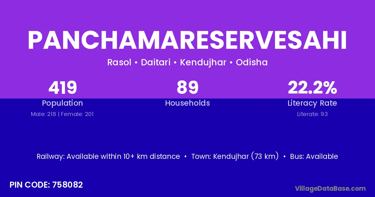 Kendujhar (73 km) is the nearest town to Panchamareservesahi village for major economic activities and is located approximately 73 km away.