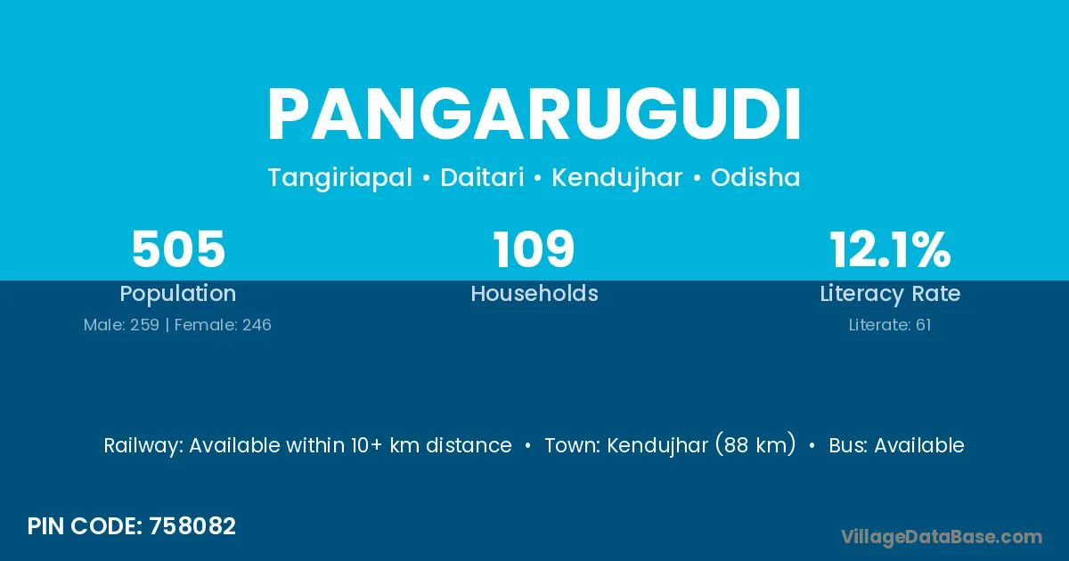 Kendujhar (88 km) is the nearest town to Pangarugudi village for major economic activities and is located approximately 88 km away.