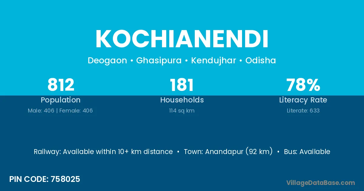 Anandapur (92 km) is the nearest town to Kochianendi village for major economic activities and is located approximately 92 km away.