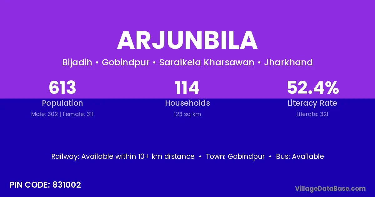 The literacy rate of Arjunbila village is 45.04%. Male literacy stands at 55.93% and female literacy at 34.42%.