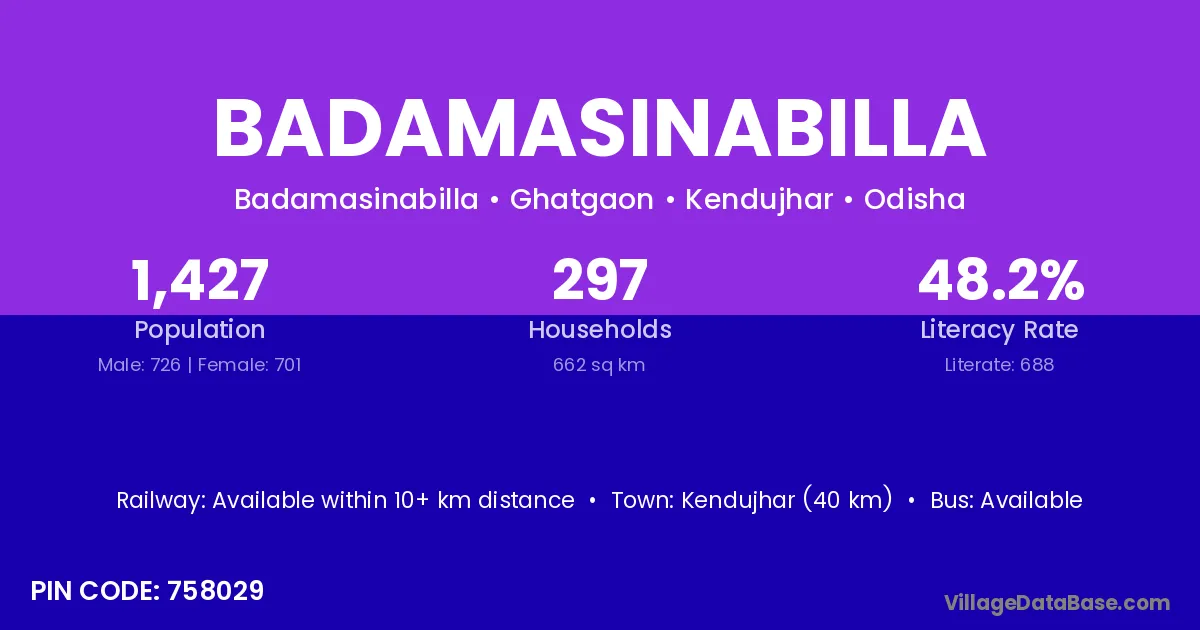 Kendujhar (40 km) is the nearest town to Badamasinabilla village for major economic activities and is located approximately 40 km away.