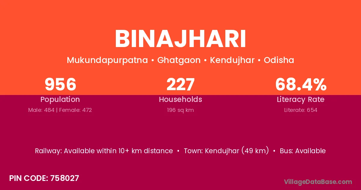 Kendujhar (49 km) is the nearest town to Binajhari village for major economic activities and is located approximately 49 km away.