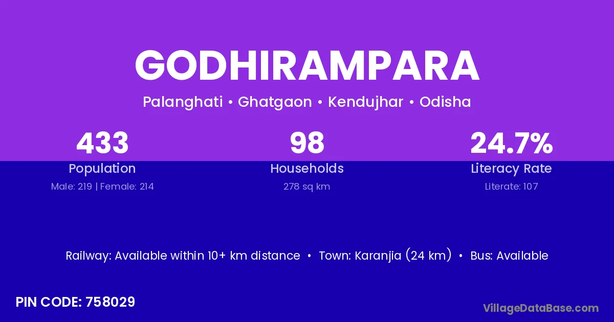 Karanjia (24 km) is the nearest town to Godhirampara village for major economic activities and is located approximately 24 km away.