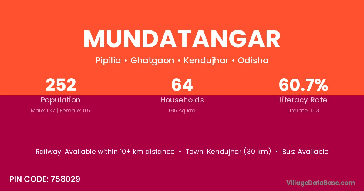 Kendujhar (30 km) is the nearest town to Mundatangar village for major economic activities and is located approximately 30 km away.