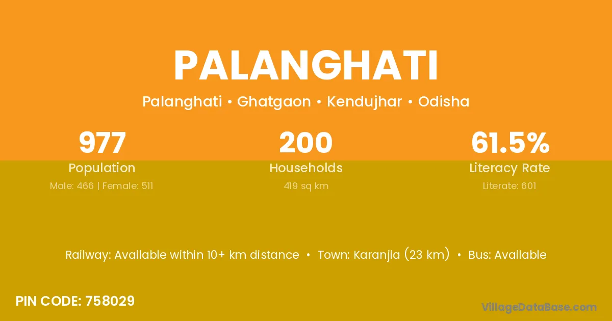 Karanjia (23 km) is the nearest town to Palanghati village for major economic activities and is located approximately 23 km away.