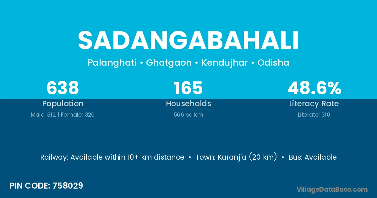 Karanjia (20 km) is the nearest town to Sadangabahali village for major economic activities and is located approximately 20 km away.