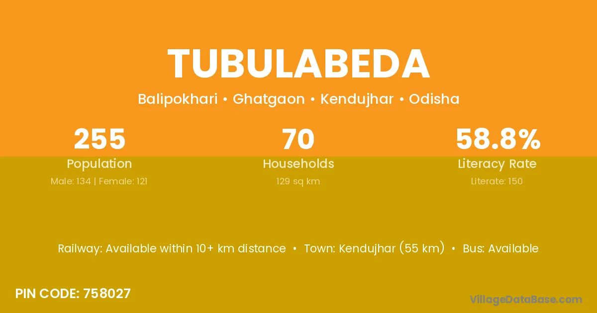 Kendujhar (55 km) is the nearest town to Tubulabeda village for major economic activities and is located approximately 55 km away.