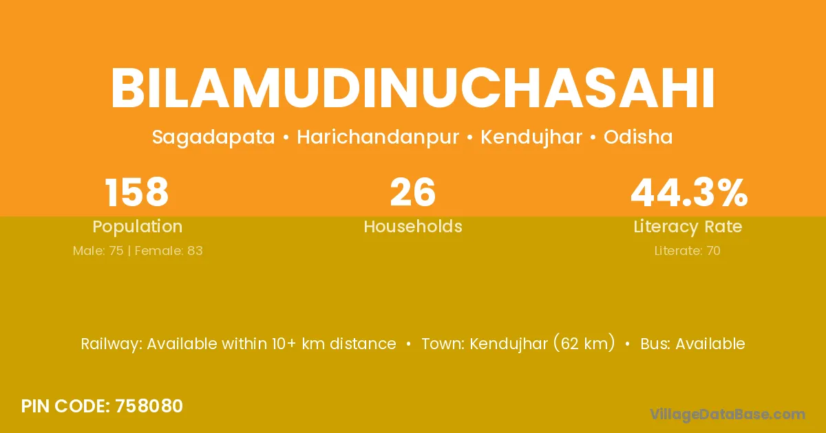 Kendujhar (62 km) is the nearest town to Bilamudinuchasahi village for major economic activities and is located approximately 62 km away.