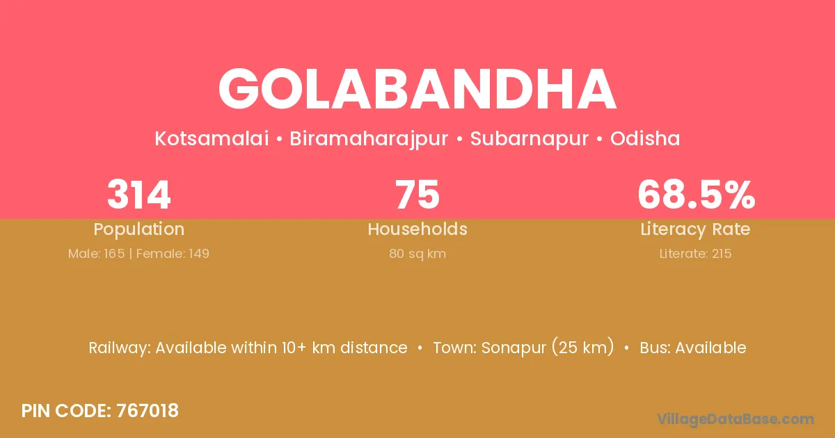 Kendujhar (48 km) is the nearest town to Golabandha village for major economic activities and is located approximately 48 km away.
