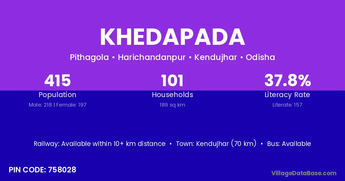 Kendujhar (70 km) is the nearest town to Khedapada village for major economic activities and is located approximately 70 km away.