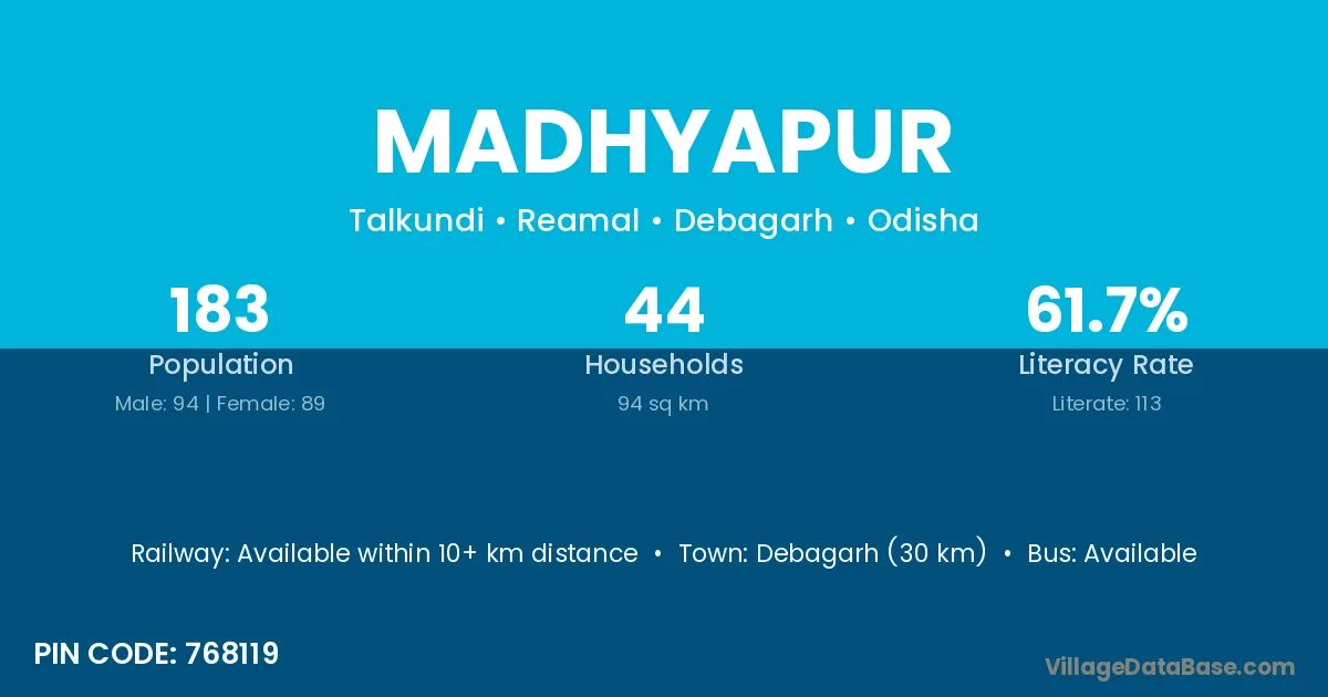 Kendujhar (56 km) is the nearest town to Madhyapur village for major economic activities and is located approximately 56 km away.