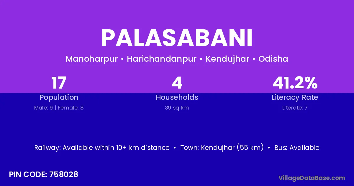 Kendujhar (55 km) is the nearest town to Palasabani village for major economic activities and is located approximately 55 km away.