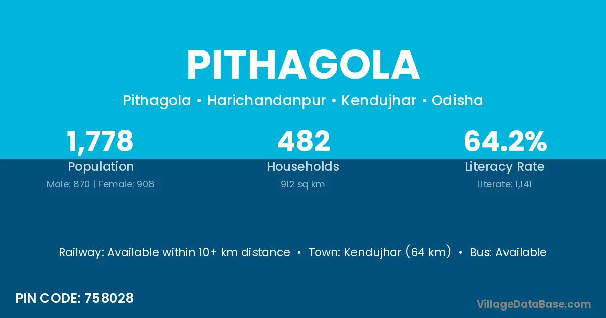 Kendujhar (64 km) is the nearest town to Pithagola village for major economic activities and is located approximately 64 km away.