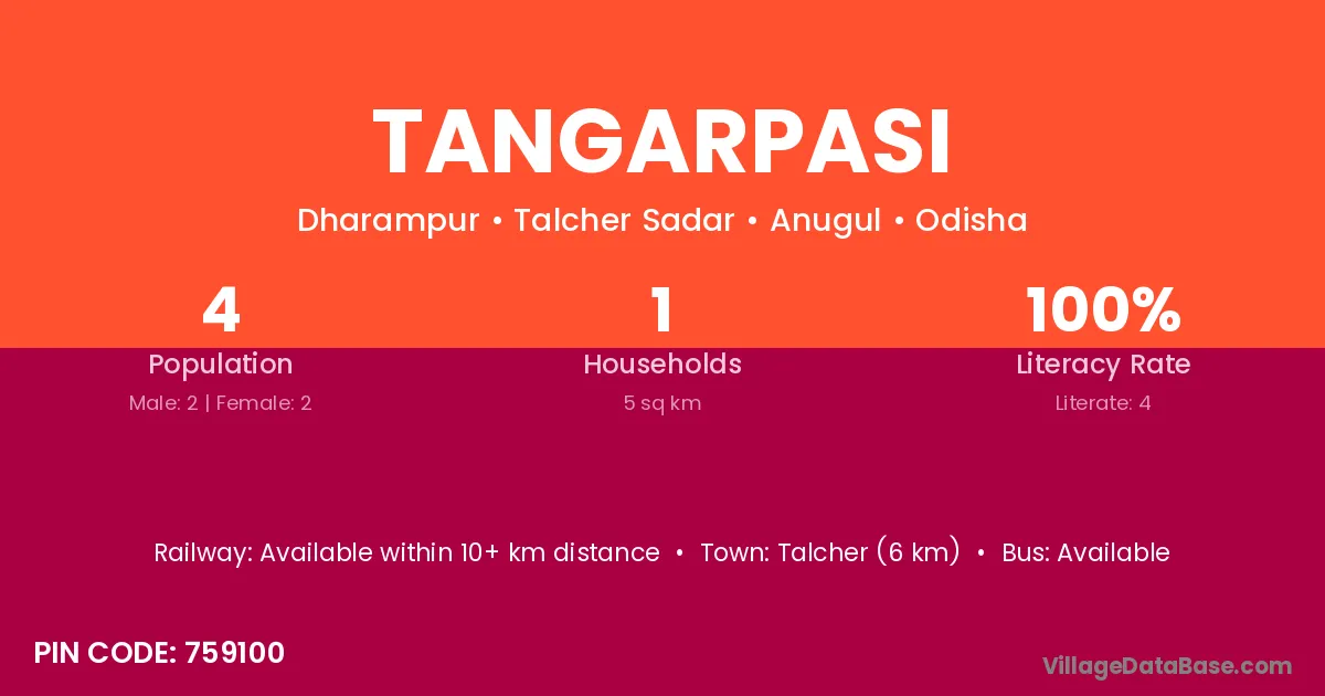 Kendujhar (64 km) is the nearest town to Tangarpasi village for major economic activities and is located approximately 64 km away.