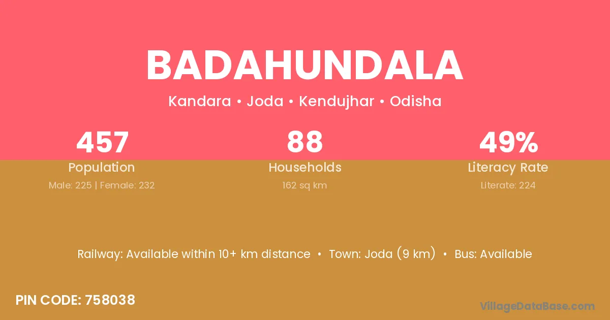 Joda (9 km) is the nearest town to Badahundala village for major economic activities and is located approximately 9 km away.