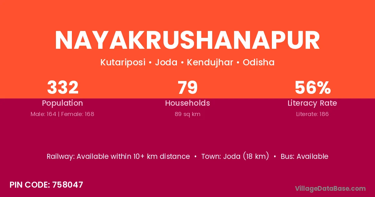 Joda (18 km) is the nearest town to Nayakrushanapur village for major economic activities and is located approximately 18 km away.