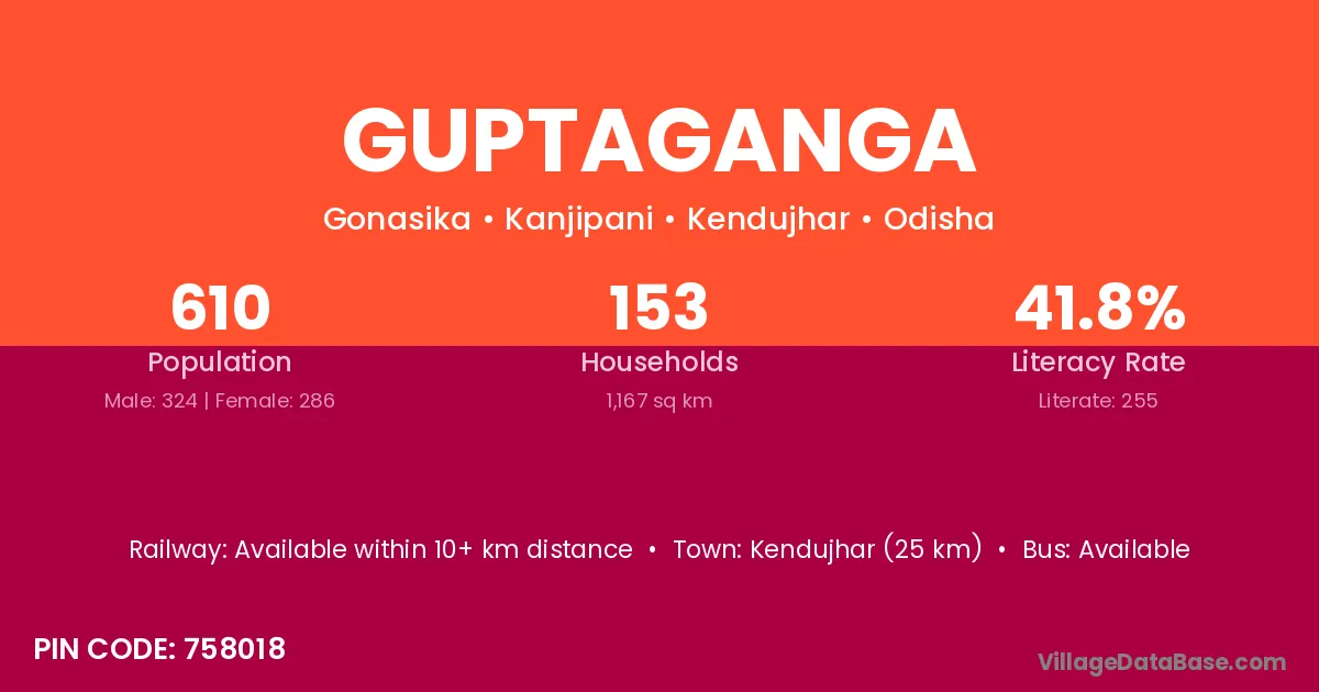 Kendujhar (25 km) is the nearest town to Guptaganga village for major economic activities and is located approximately 25 km away.