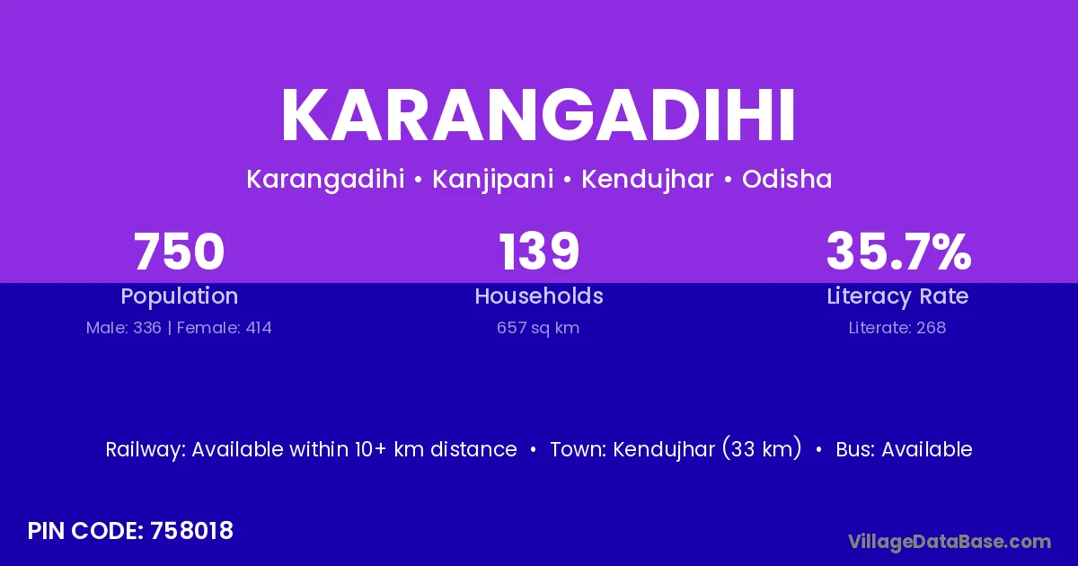 Kendujhar (33 km) is the nearest town to Karangadihi village for major economic activities and is located approximately 33 km away.