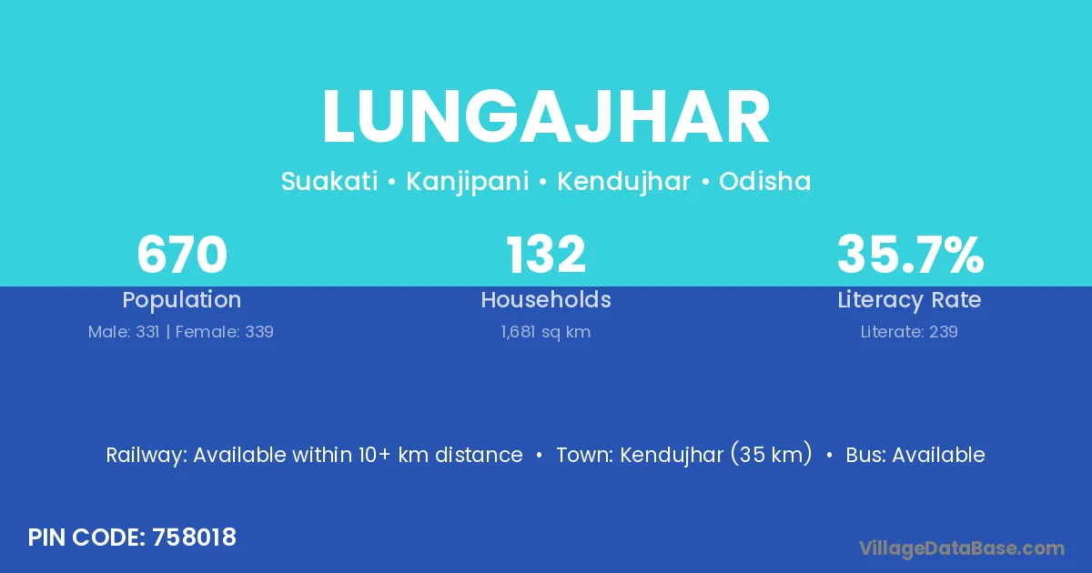 Kendujhar (35 km) is the nearest town to Lungajhar village for major economic activities and is located approximately 35 km away.