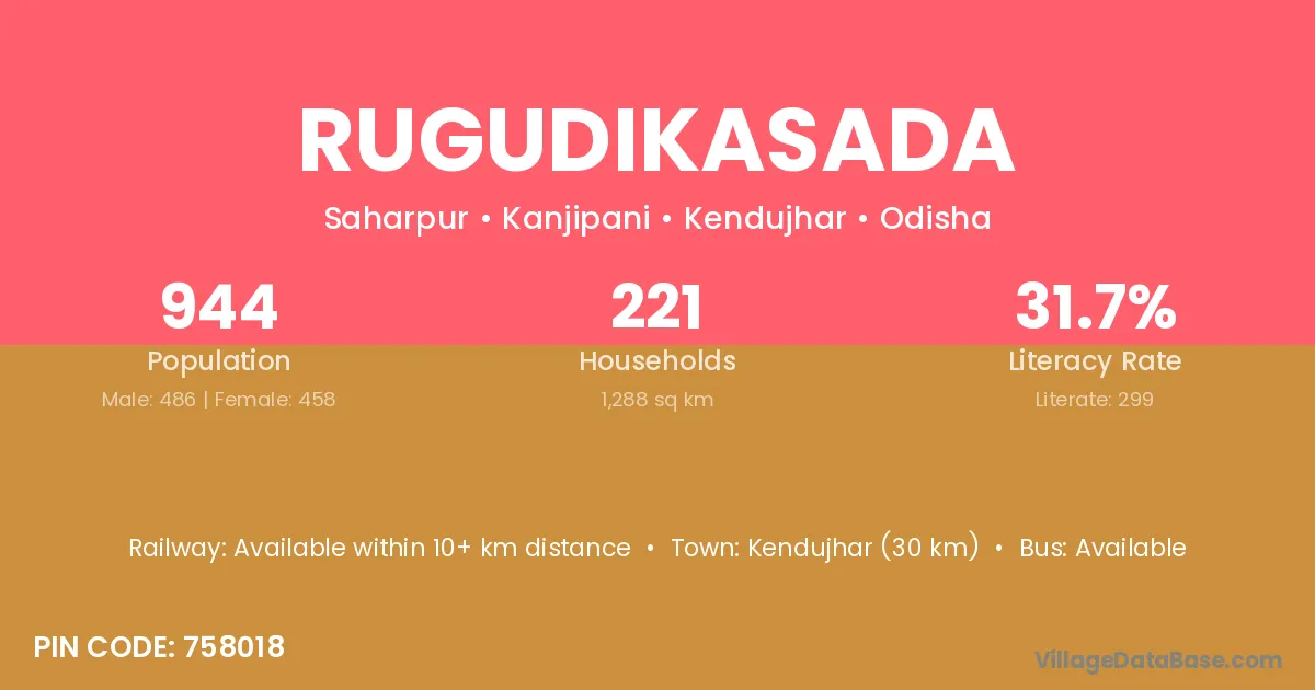 Kendujhar (30 km) is the nearest town to Rugudikasada village for major economic activities and is located approximately 30 km away.
