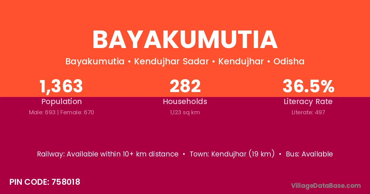 Kendujhar (19 km) is the nearest town to Bayakumutia village for major economic activities and is located approximately 19 km away.