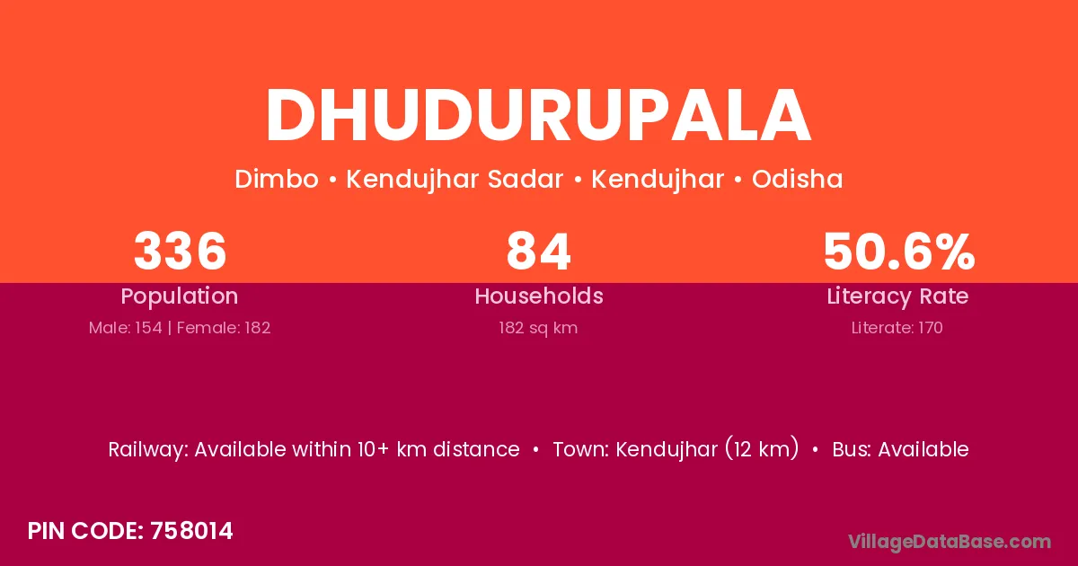 Kendujhar (12 km) is the nearest town to Dhudurupala village for major economic activities and is located approximately 12 km away.